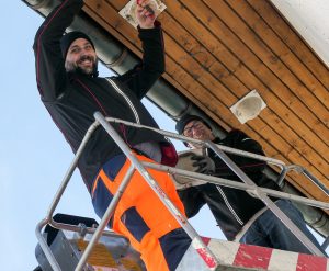 Dank einer Hebebühne kann diese Arbeit in luftiger Höhe sicher ausgeführt werden.